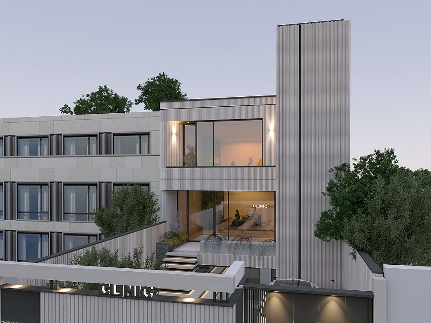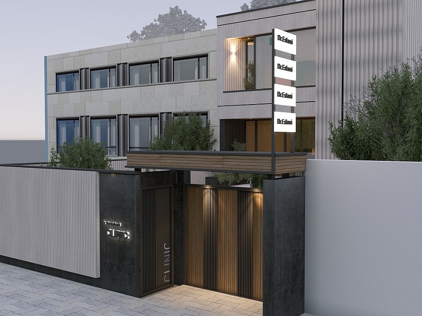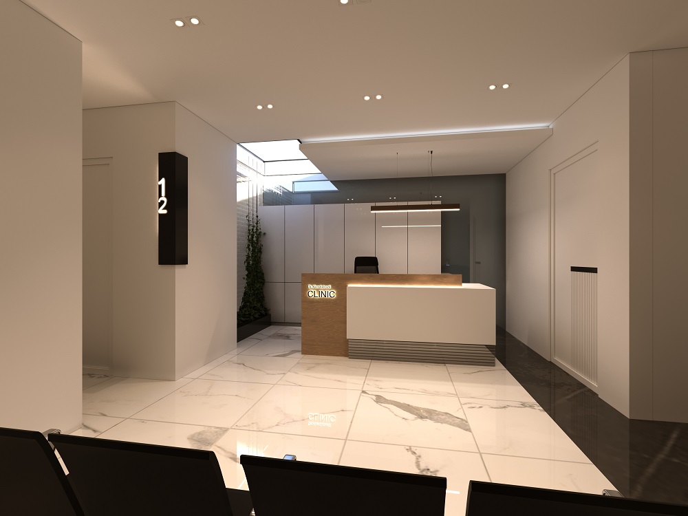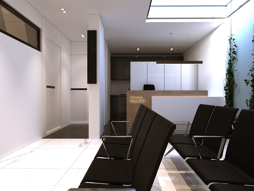 نمونه کار بازسازی بازسازی پروژه میرحسینی شهرک فاضل طراحی داخلی مدرن با متریال هایگلس، طراحی حیاط با سنگ اسلب بازسازی کلینیک بازارچه رویکرد مینیمال و آرامش بخش، استفاده از رنگ های حنثی، ترکیب چوب و شیشه